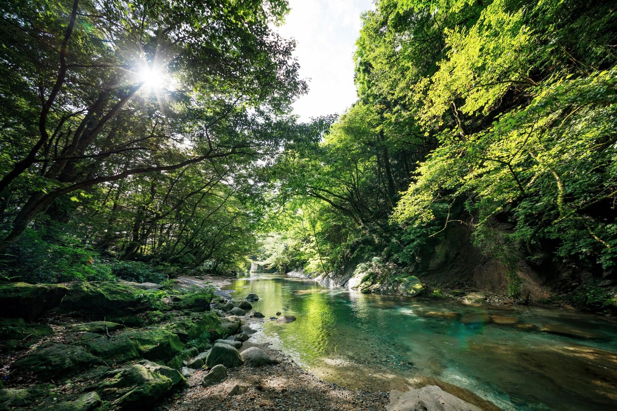 渓谷沿いには豊かな緑が広がり、春の新緑、秋の紅葉、と四季折々の景色が楽しめます。