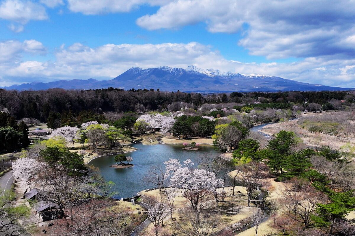 春: 4月中旬に桜とチューリップが那須連山を背景に咲き誇ります。4月下旬には緑色の珍しい桜「御衣黄」が咲き、5月は新緑のベストシーズンを迎えます。